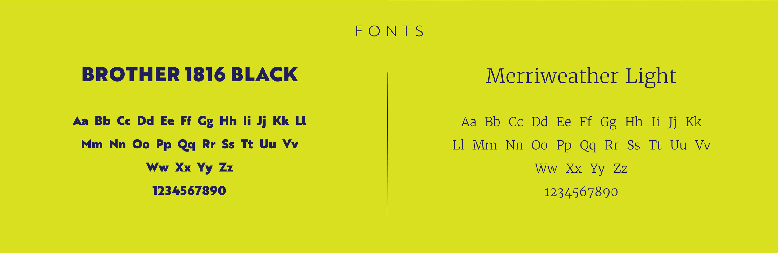 As Brother 1816 takes the focus in my logo, I wanted to incorporate that in my branding as well, making for a seamless flow. Paired with the light weight Merriweather for body copy.